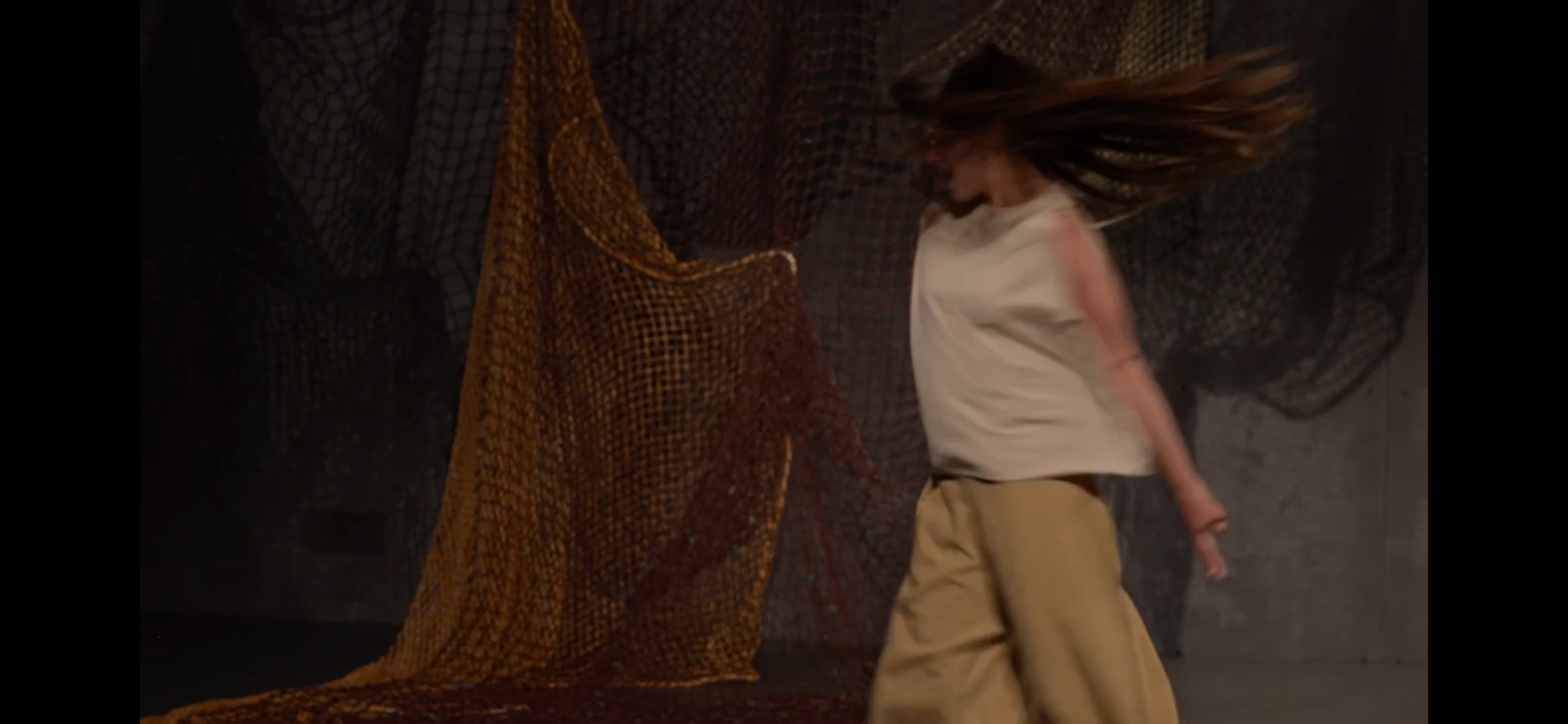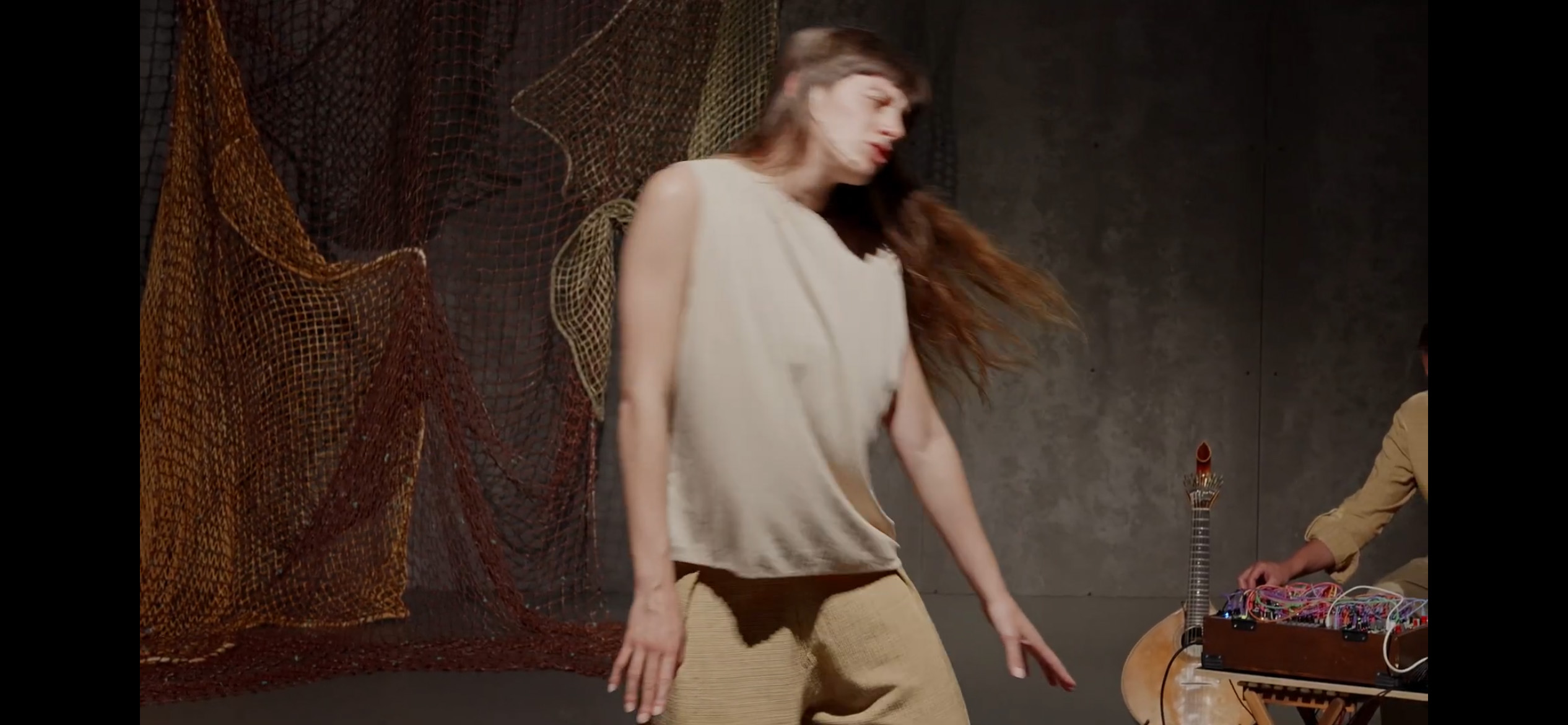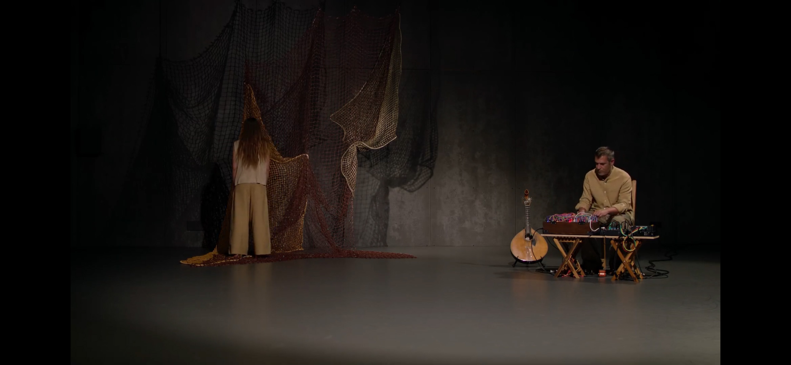 Scénographie / installation textile pour le soupir du sable de Zoë et Philippe de Sousa. Le soupir du sable est un moment d’échange entre un père, Philippe De Sousa, musicien de guitare portugaise, et sa fille, Zoë De Sousa, danseuse. Le duo se fonde sur un passé commun: la culture du fado, ses chants et ses vitalités. C’est à partir de cet héritage que les deux artistes développent leur pratique actuelle (la danse contemporaine pour l’une, les synthèses modulaires pour l’autre) déployant alors un nouveau champ créatif, où se rencontrent musique traditionnelle et électronique, chant et danse, fille et père. Le soupir du sable rassemble des histoires liées au fado, vouées à être transformées, réinterprétées, au coeur d’un dialogue filial et artistique.