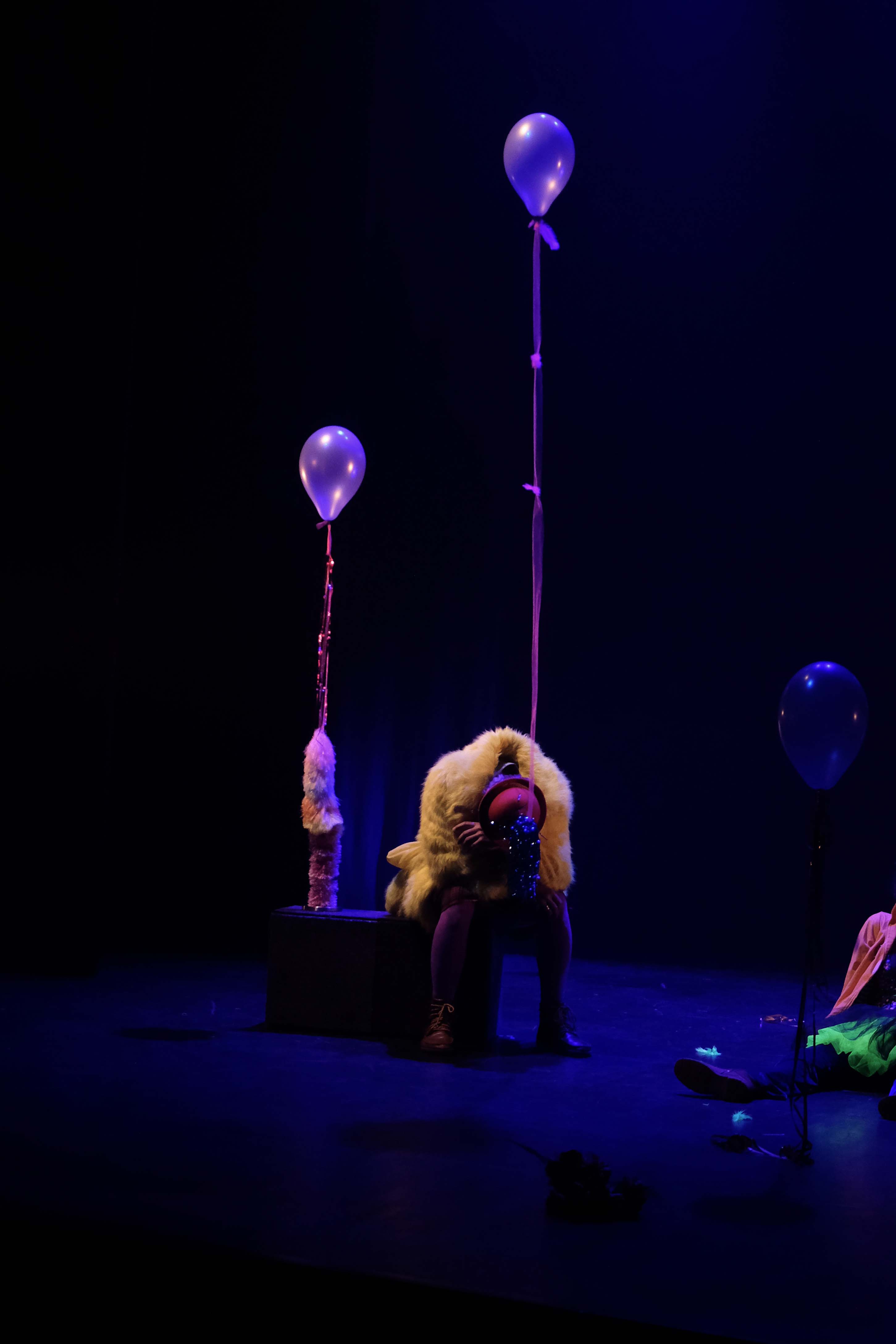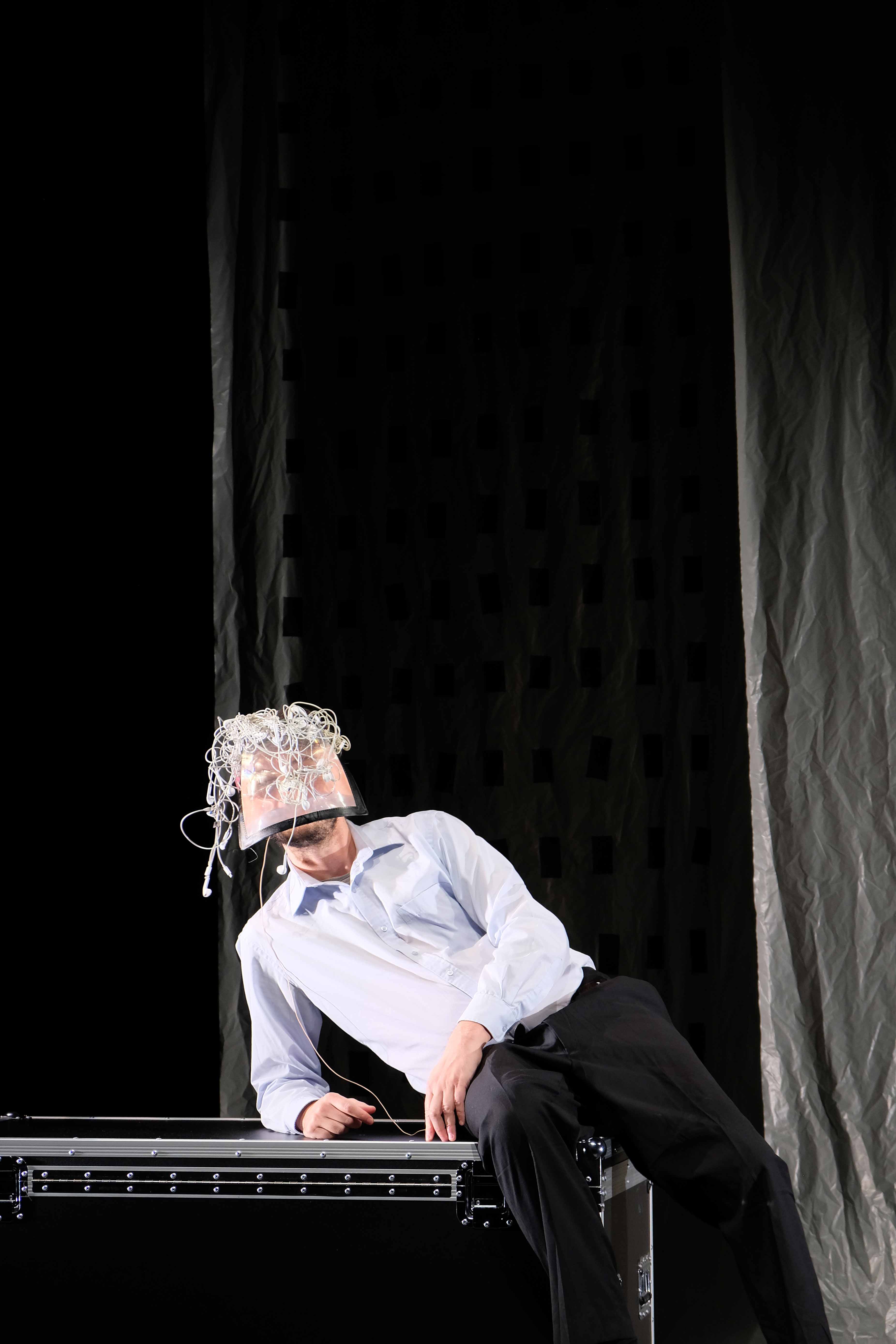 La partie textile de la scénographie ainsi que le costume sont réalisés à partir d’un patchwork de collants de différents deniers.